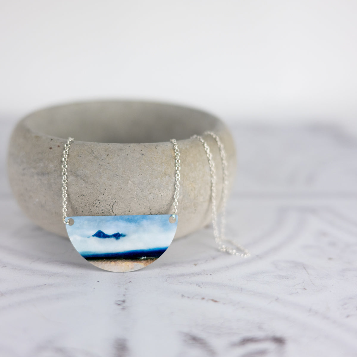Cath's Scottish landscape artwork on a lightweight, hypo-allergenic, glossy, 5cm wide semi-circular aluminium pendant with a 18" solid sterling silver belcher chain presented in a black two piece gift box. Unique and unusual, easy to wear, statement jewellery. Designed and handmade in Cath's workshop.