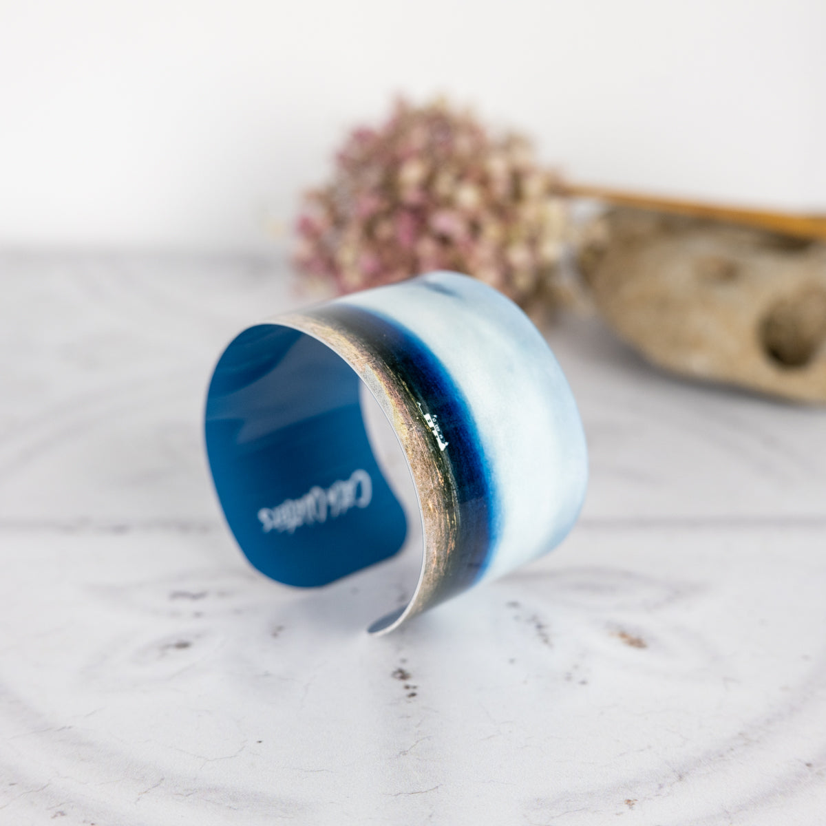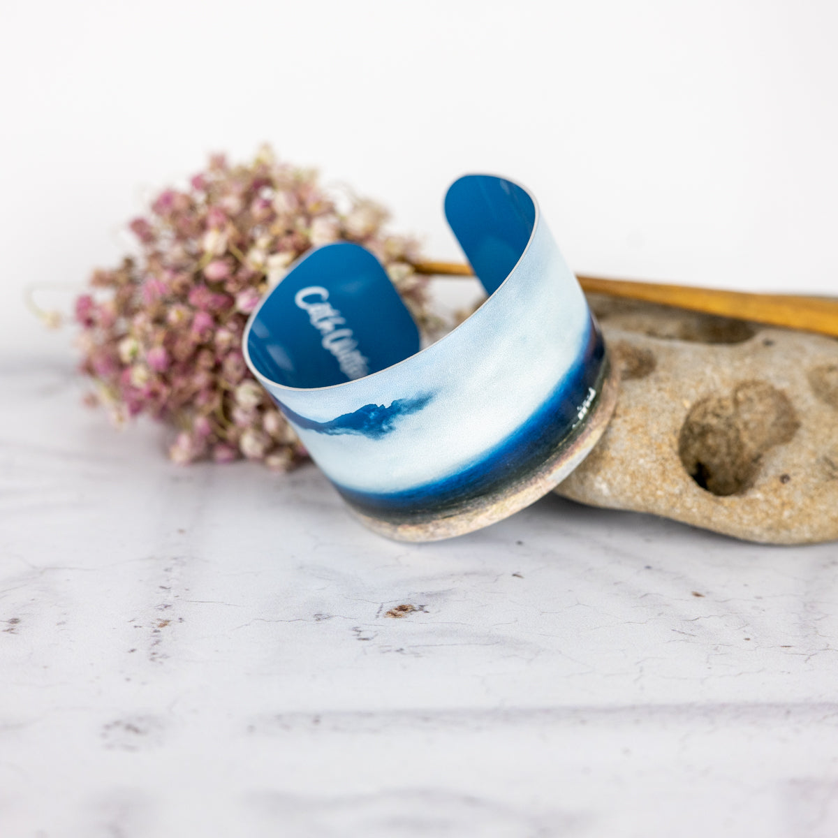 Cath's Scottish landscape artwork on a lightweight, hypo-allergenic, glossy aluminium cuff bangle presented in a black two piece branded gift box. Unique and unusual, easy to wear, statement jewellery. Made by hand in Cath's workshop. Now with coordinating inner colour.