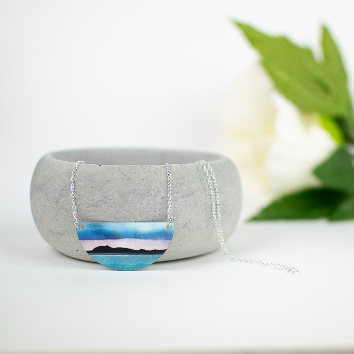 Cath's Scottish landscape artwork on a lightweight, hypo-allergenic, glossy, 5cm wide semi-circular aluminium pendant with a 18" solid sterling silver belcher chain presented in a black two piece gift box. Unique and unusual, easy to wear, statement jewellery. Designed and handmade in Cath's workshop.