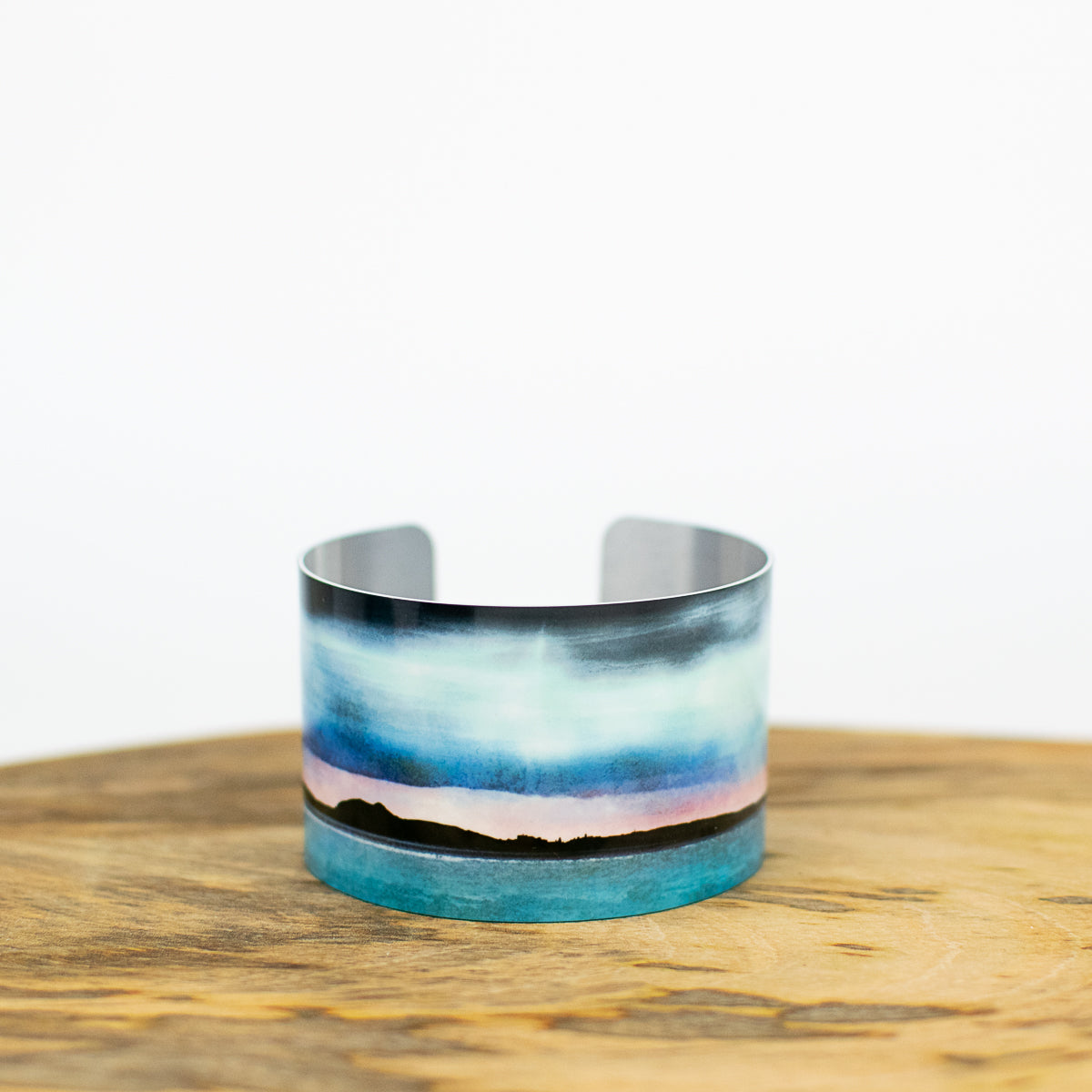 Cath's Scottish landscape artwork on a lightweight, hypo-allergenic, glossy aluminium cuff bangle presented in a black two piece branded gift box. Unique and unusual, easy to wear, statement jewellery. Made by hand in Cath's workshop. Now with coordinating inner colour.