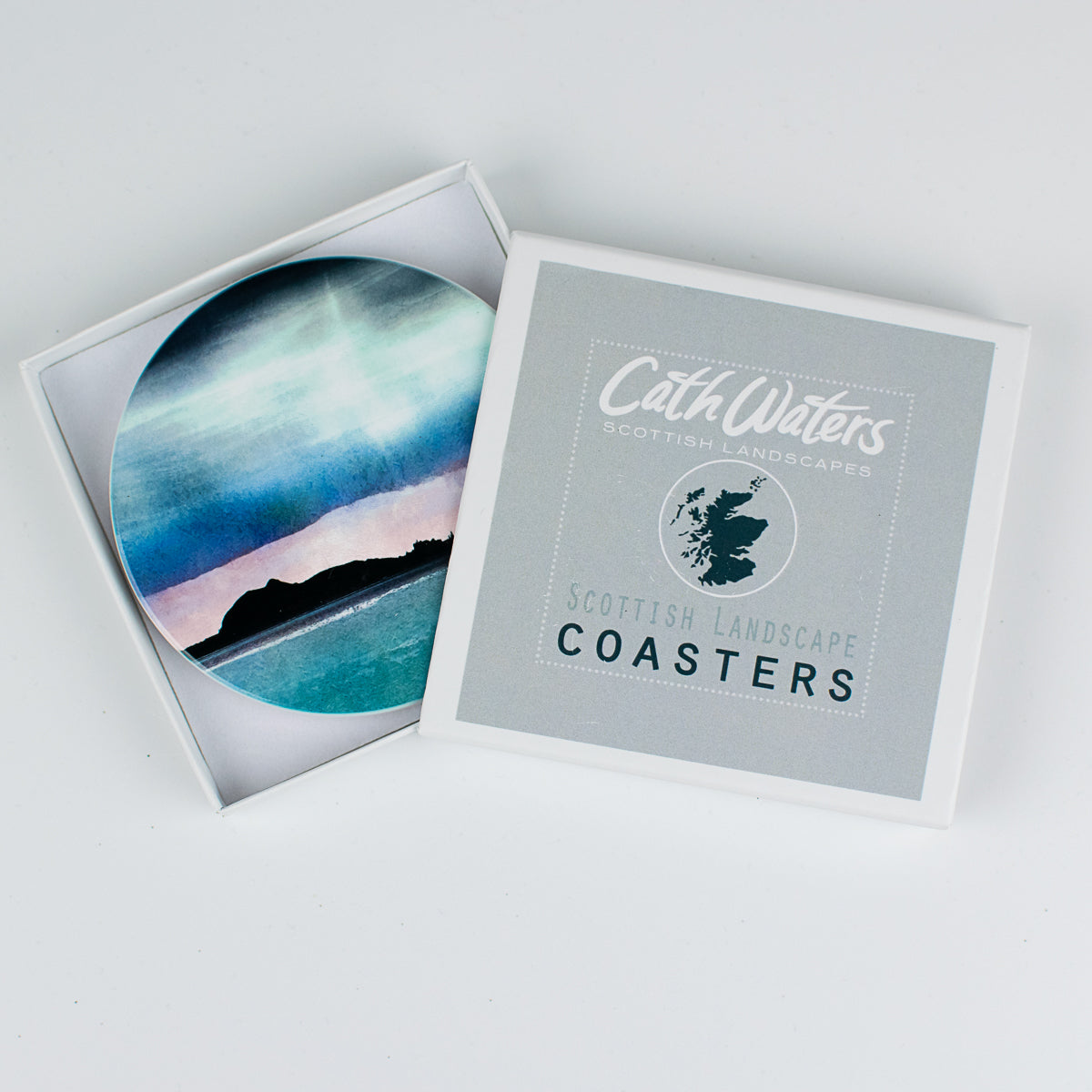 A beautifully glossy, 9 cm cork backed ceramic coaster. This is an individual coaster with matchbox style gift box. Coasters are also available in boxed "pick your own" sets of 4 (see separate product page to order) Matching mugs are available.