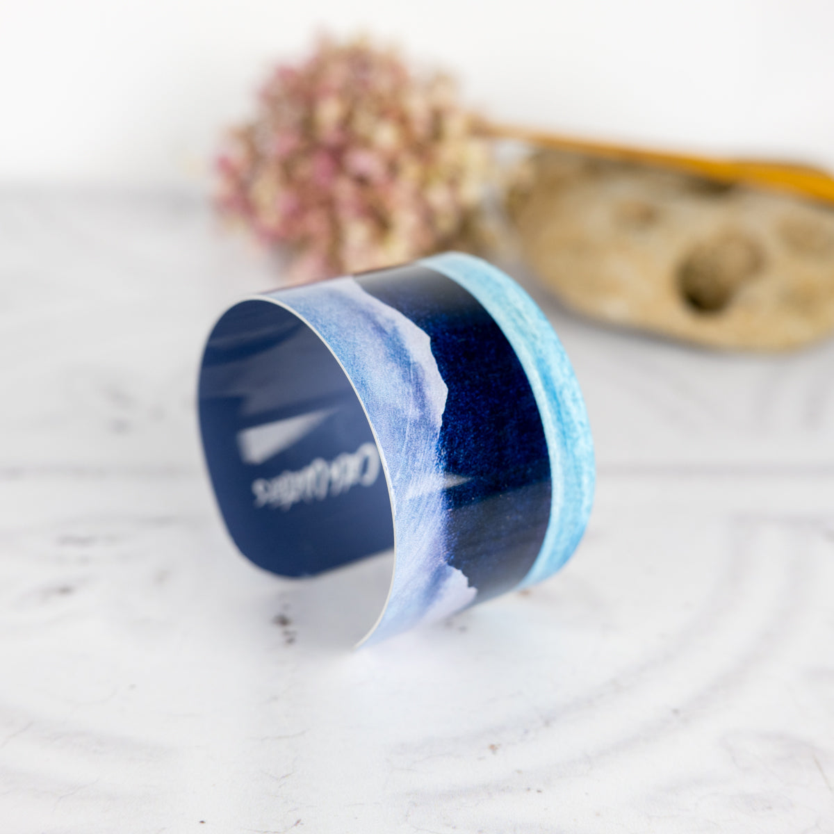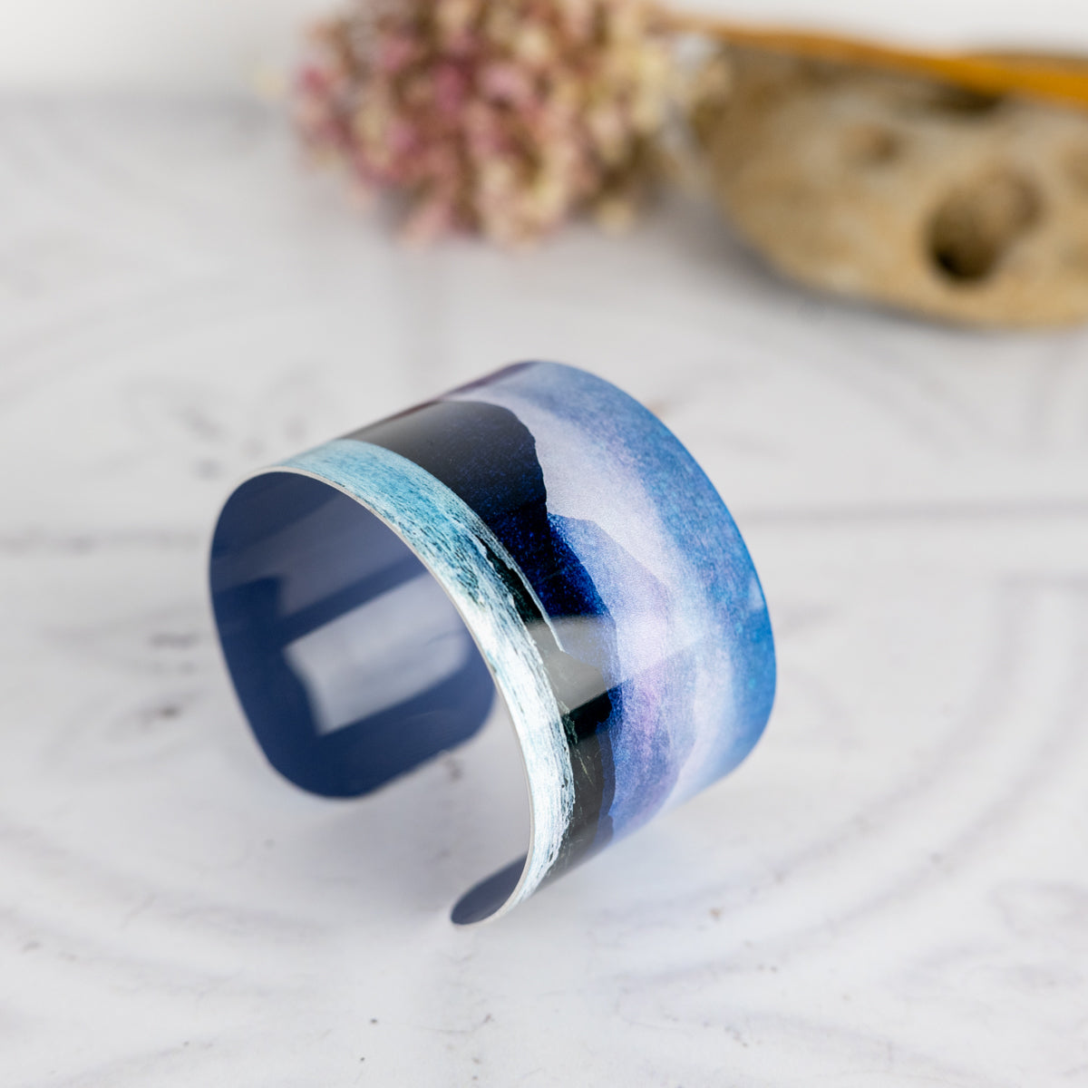 Cath's Scottish landscape artwork on a lightweight, hypo-allergenic, glossy aluminium cuff bangle presented in a black two piece branded gift box. Unique and unusual, easy to wear, statement jewellery. Made by hand in Cath's workshop. Now with coordinating inner colour.