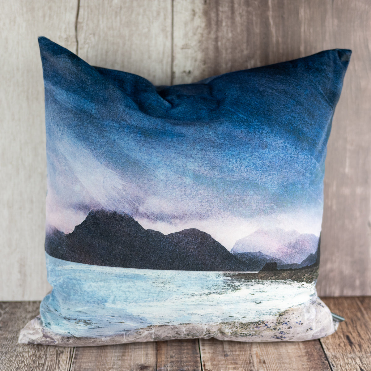 Scottish landscape velvet cushions, printed and stitched by a traditional 100 year old company in Lancashire’s textile heartland. Each cushion is 45cm square with vibrant, removable covers, printed on both sides with Cath's Scottish Landscape Art. Cushions feature a hidden black zip fastening and an optional, high quality, luxuriously comfortable, feather inner pad. Designed in Scotland, made in the UK. Please note our new velvet cushions replace our previous cushion range.