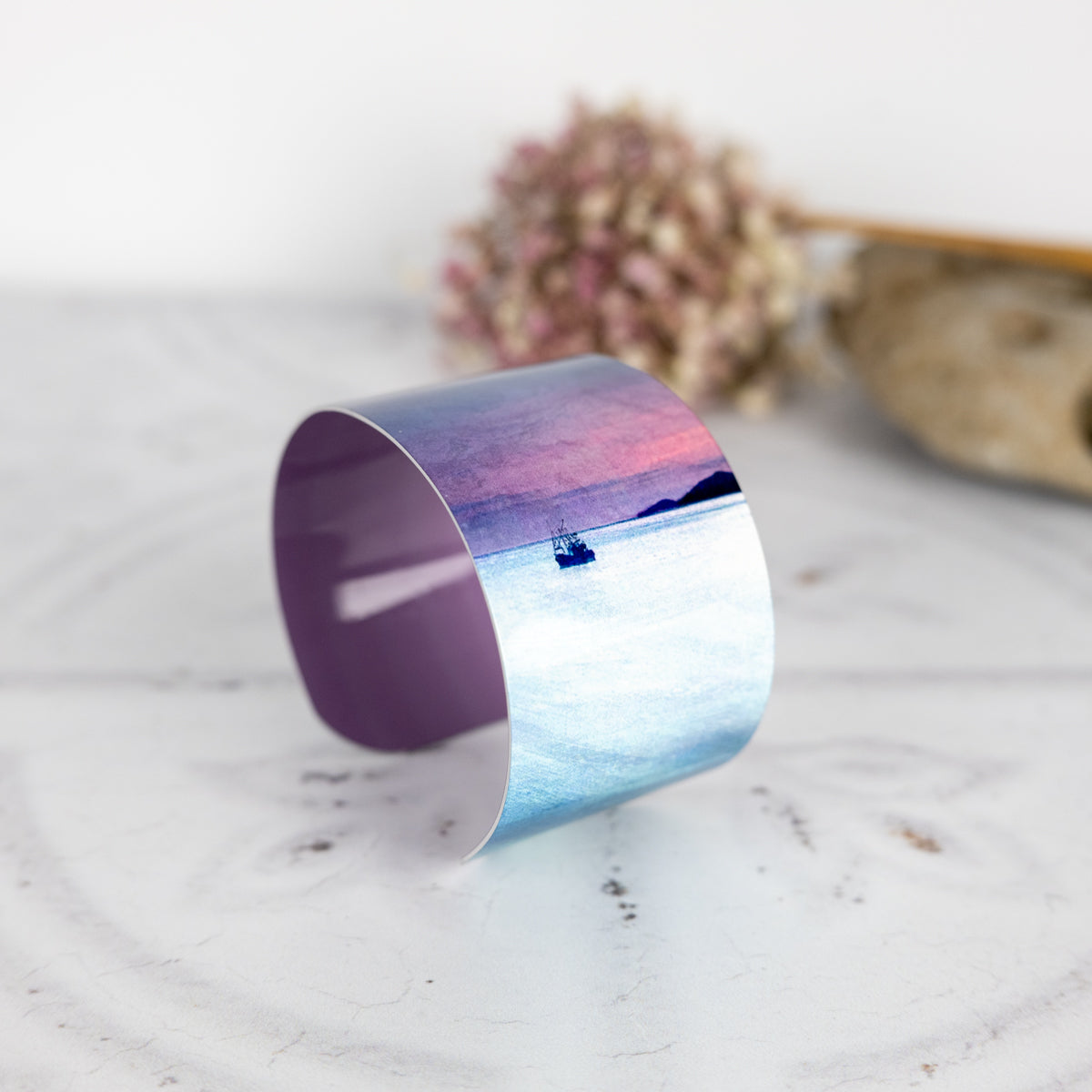 Cath's Scottish landscape artwork on a lightweight, hypo-allergenic, glossy aluminium cuff bangle presented in a black two piece branded gift box. Unique and unusual, easy to wear, statement jewellery. Made by hand in Cath's workshop. Now with coordinating inner colour.