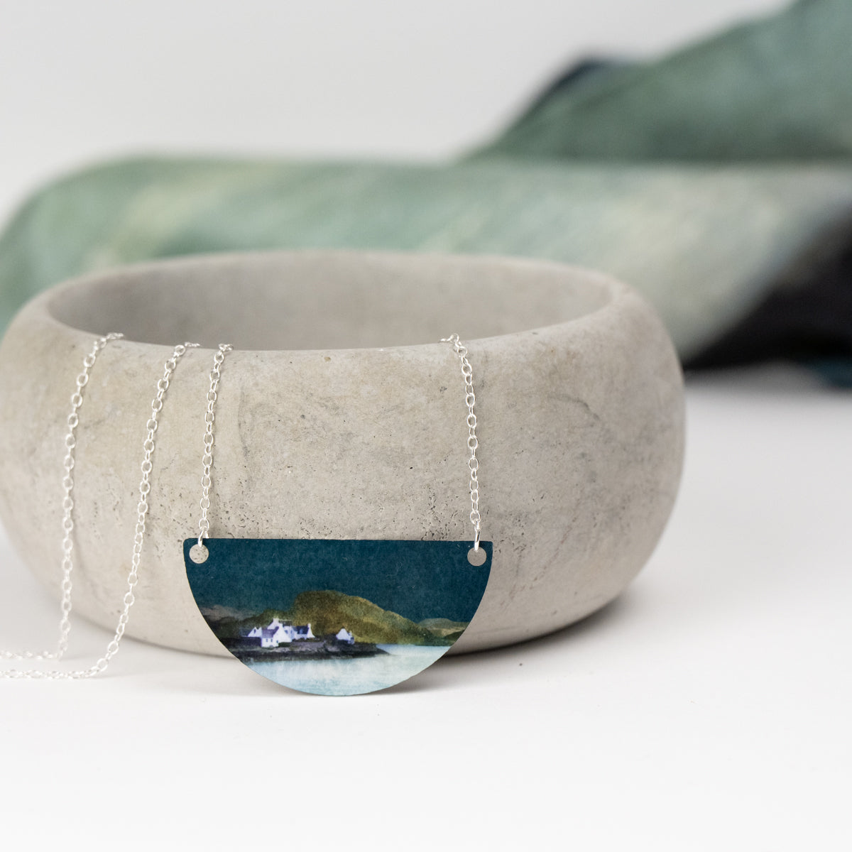 Cath's Scottish landscape artwork on a lightweight, hypo-allergenic, glossy, 5cm wide semi-circular aluminium pendant with a 18" solid sterling silver belcher chain presented in a black two piece gift box. Unique and unusual, easy to wear, statement jewellery. Designed and handmade in Cath's workshop.