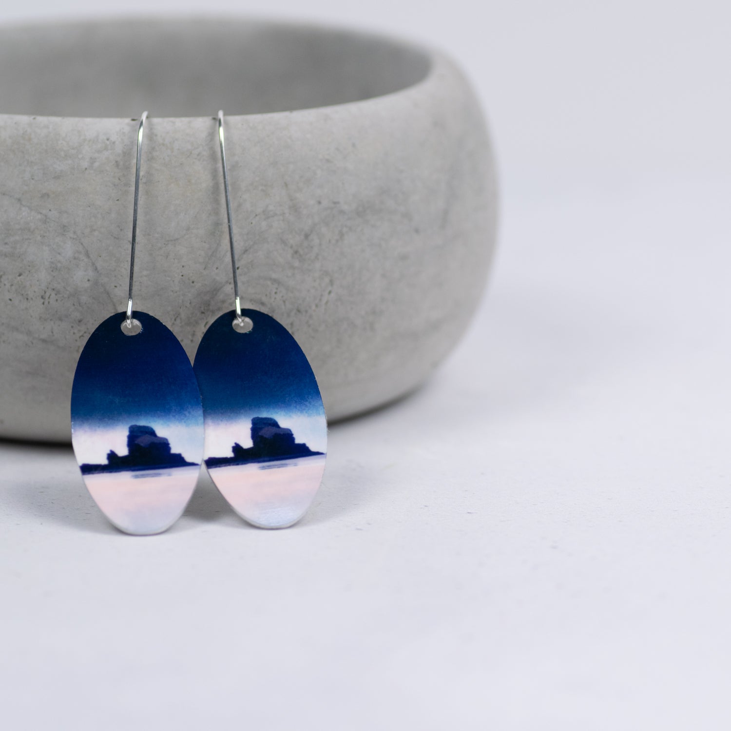 Cath's Scottish landscape artwork on lightweight, hypo-allergenic, glossy aluminium, pendant earrings with 3.6cm long solid sterling silver ear wires presented in a black two piece gift box. Unique and unusual, easy to wear, statement jewellery.
