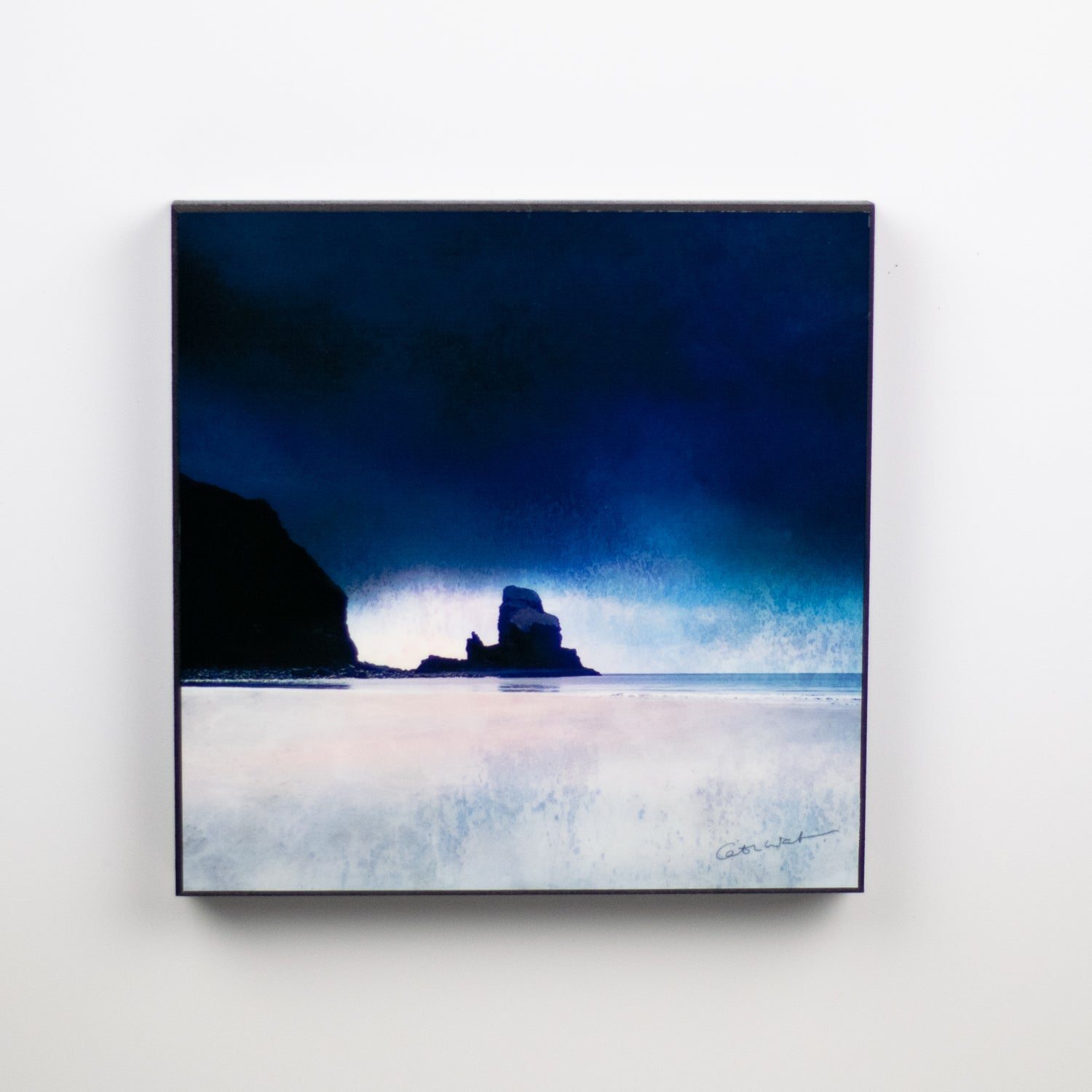 Glossy 15 cm, black edged wood blocks with wall hanging fixture. Can also be displayed free standing on a shelf.