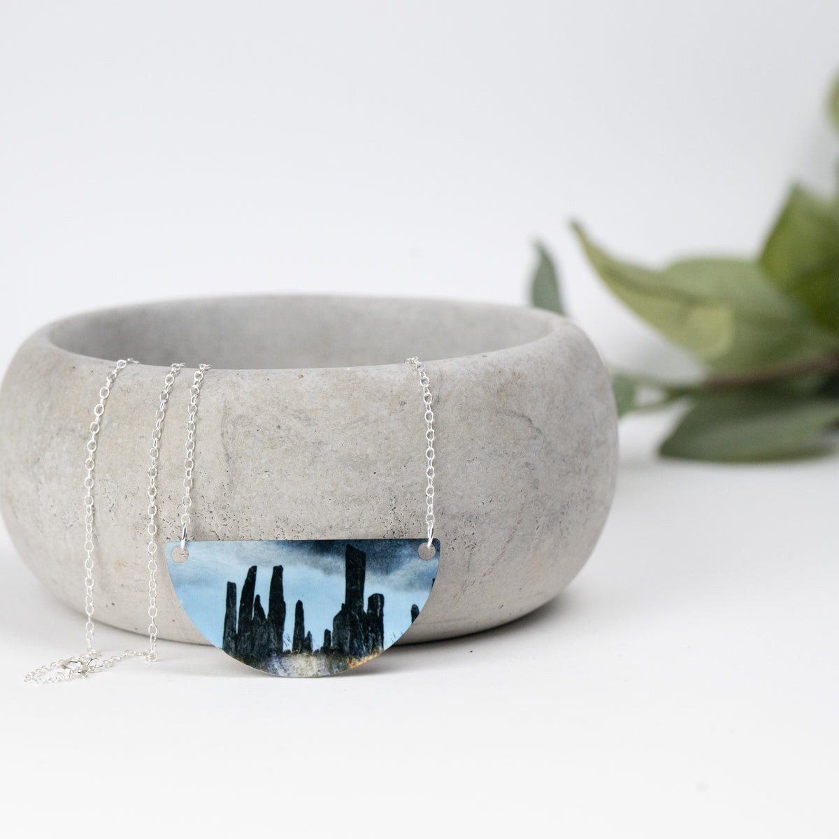 Cath's Scottish landscape artwork on a lightweight, hypo-allergenic, glossy, 5cm wide semi-circular aluminium pendant with a 18" solid sterling silver belcher chain presented in a black two piece gift box. Unique and unusual, easy to wear, statement jewellery. Designed and handmade in Cath's workshop.