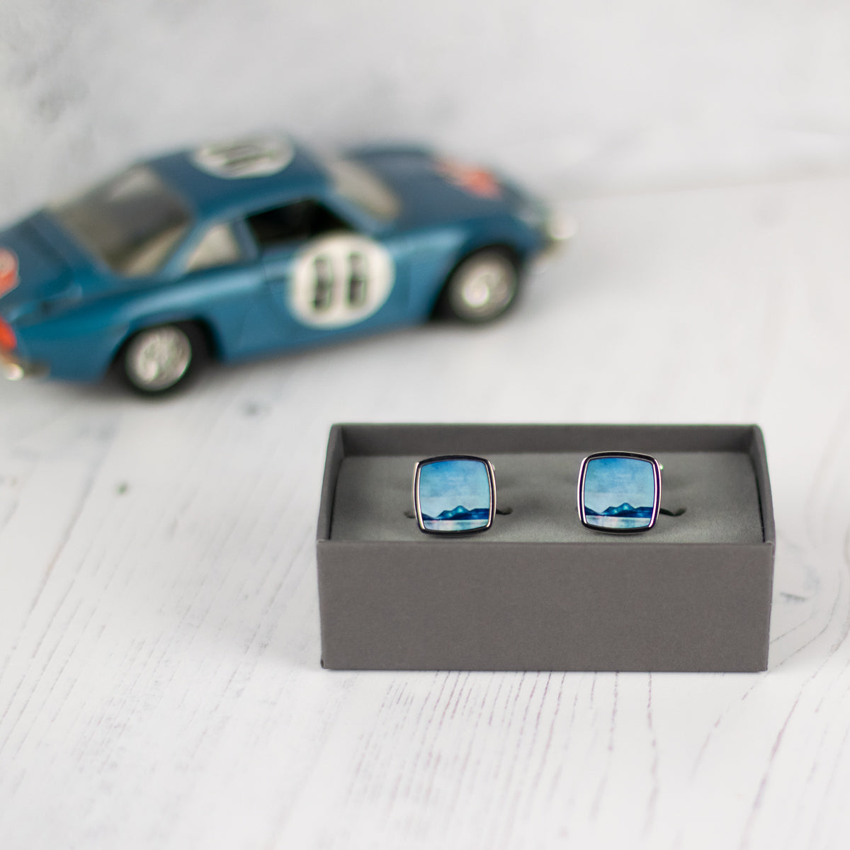 Stylish chrome coloured cufflinks featuring tiny versions of Cath's Scottish Landscape artwork. Presented in grey gift boxes. Printed at Cath's workshop on the Isle of Skye. Cufflinks are made from zinc alloy and printed aluminium.
