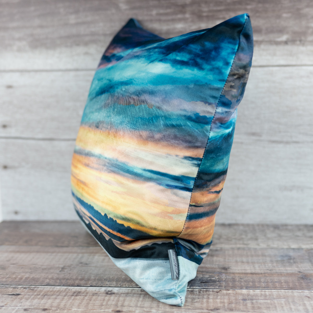 Scottish landscape velvet cushions, printed and stitched by a traditional 100 year old company in Lancashire’s textile heartland. Each cushion is 45cm square with vibrant, removable covers, printed on both sides with Cath's Scottish Landscape Art. Cushions feature a hidden black zip fastening and an optional, high quality, luxuriously comfortable, feather inner pad. Designed in Scotland, made in the UK. Please note our new velvet cushions replace our previous cushion range.